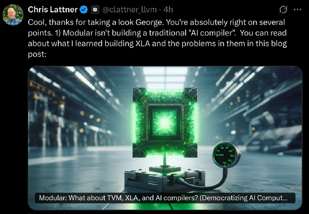记录这个文章的起点是,发现Chris在和geohot(重新认识geohot中的geohot)就什么是AI compiler的终极形态的讨论: