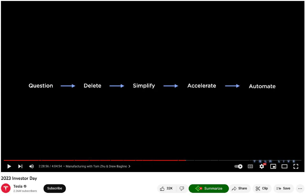 elon_musk_5_step2022-03-21 14:56:00 PUBLIC5-step:MAKE THE REQUIREMENTS LESS DUMBTRY AND DELETE PART OF THE PROCESSSIMPLIFY OR OPTIMIZEACCELERATE CYCLE TIMEAUTOMATE2023 investor day特别提到