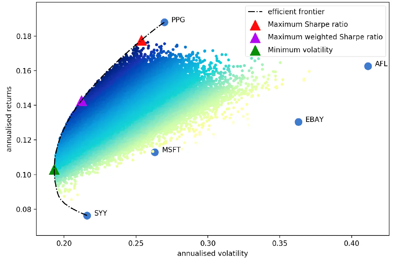 通过组合资产占比,获得大量的采样点,而这些采样点形成了一个等高线(efficient frontier),等高线右下角的区域是无需考虑的,因为他们要么同等收益,波动更大,要么同等波动,收益更小。