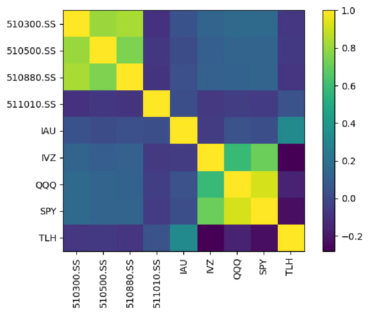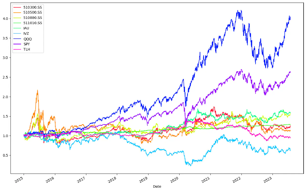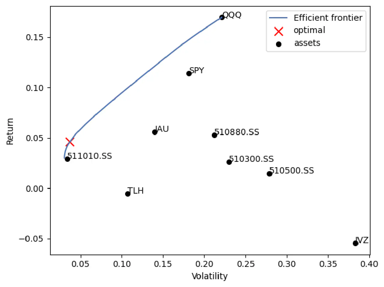 symbol 比例 metrics performance 510300.SS -0.14312 Expected annual return 15.2% 510500.SS -0.08051 Annual volatility 11.4% 510880.SS 0.25929 Sharpe Ratio 1.15 511010.SS 0.80922 IAU 0.19586 IVZ -0.27263 QQQ 0.41713 SPY 0.18781 TLH -0.37304