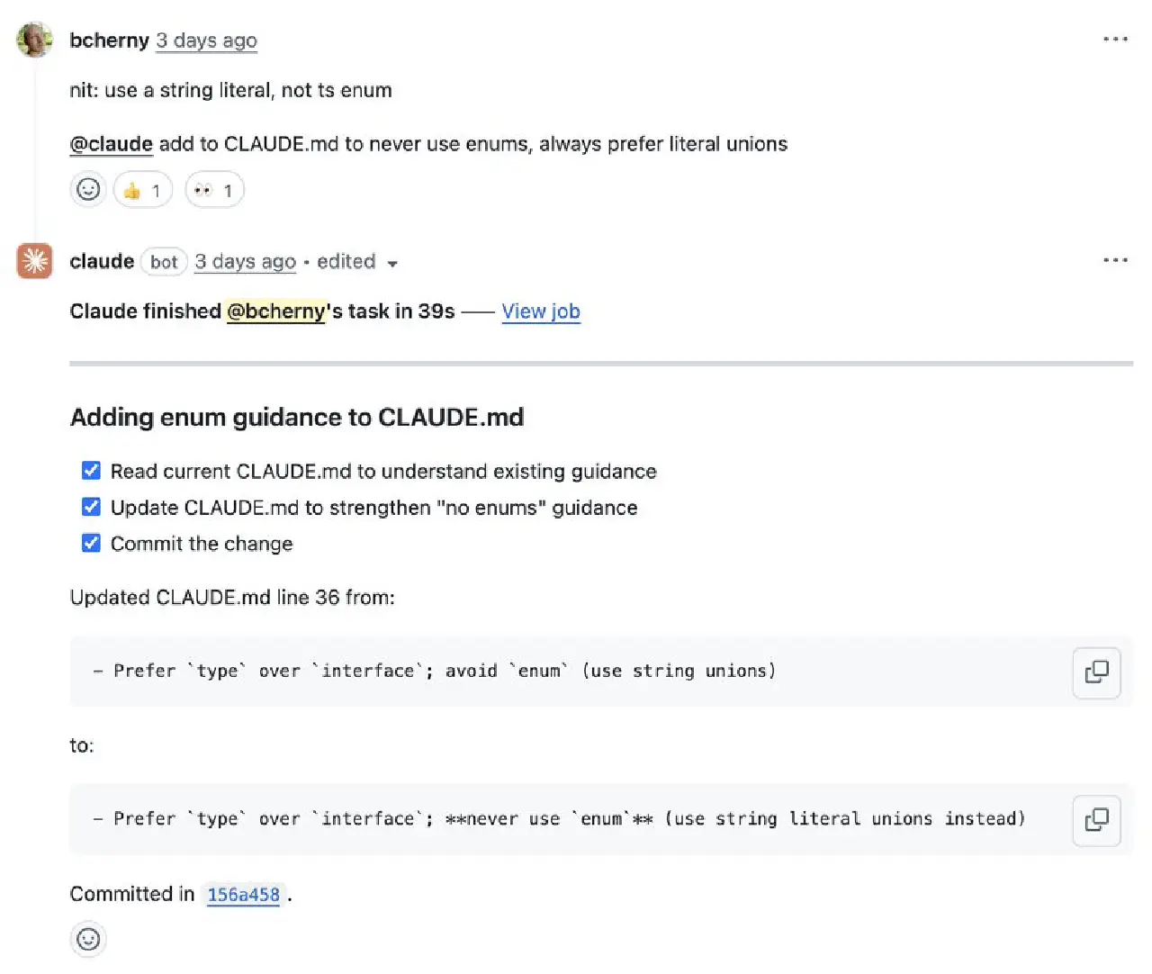 During code review, I will often tag @.claude on my coworkers’ PRs to add something to the http://claude.md as part of the PR. We use the Claude Code Github action (/install-github-action) for this.