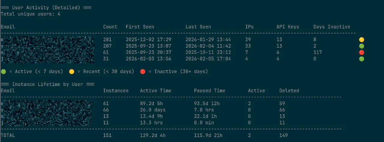 vastai show audit-logs 可以给详细的统计信息,Team中不同的member的使用量什么的,如果想搞也可以,不过也没必要吧,毕竟vastai相比正规军,已经便宜太多了。。。